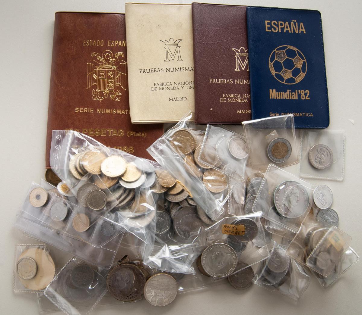 ESTADO ESPAÑOL y CONTEMPORANEO. Conjunto de más de 100 monedas que incluye 11 monedas de 100 Pesetas de 1966 con diferentes estrellas (Todas las estrellas representadas. Las dos monedas con *69 retocadas), algunas piezas con errores, tiras y carteras. Gran variedad de módulos, valores y fechas. Diferentes estados de conservación. A EXAMINAR.