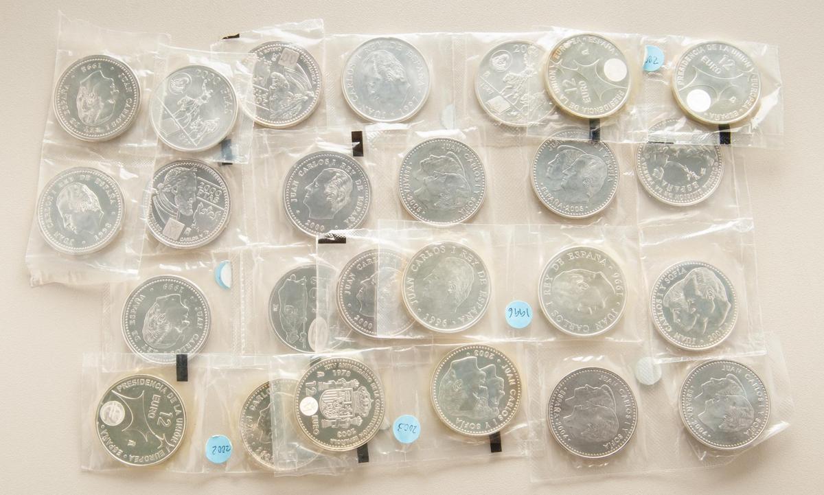 CONTEMPORÁNEO. Conjunto formado por 25 monedas con valores de 2000 Pesetas y 12 Euros en plata acuñadas durante el reinado de Juan Carlos I entre 1997 y 2005. SC.