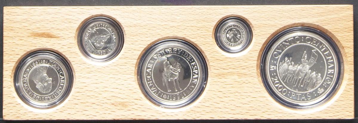 JUAN CARLOS I (1975-2014). Serie completa de 5 monedas de plata del 500 Aniversario del Descubrimiento de América. Valores comprendidos entre 100 y 2000 Pesetas. 1991. FDC. Incluye estuche original y certificado de autenticidad.