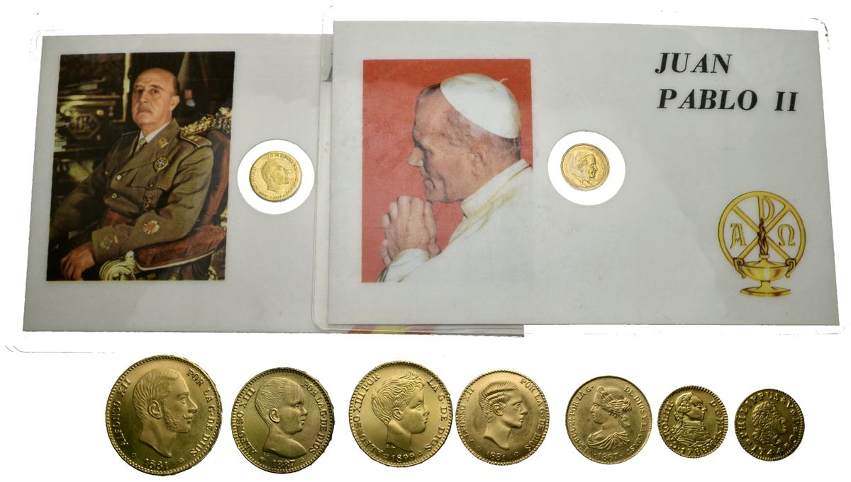 CONTEMPORANEO. Bonito conjunto formado por 7 replicas de joyería en oro de monedas históricas españolas. Peso total del conjunto: 30,37g. Pureza del oro: 69%. SC. Incluye además dos tarjetas conmemorativas con sendas monedas a nombre de F. Franco y Juan Pablo II. A EXAMINAR.