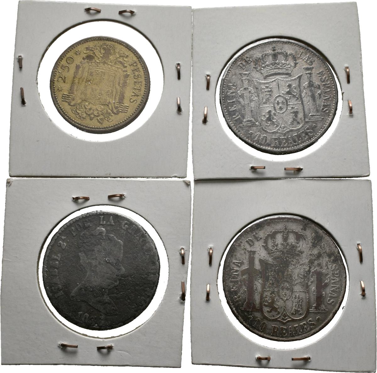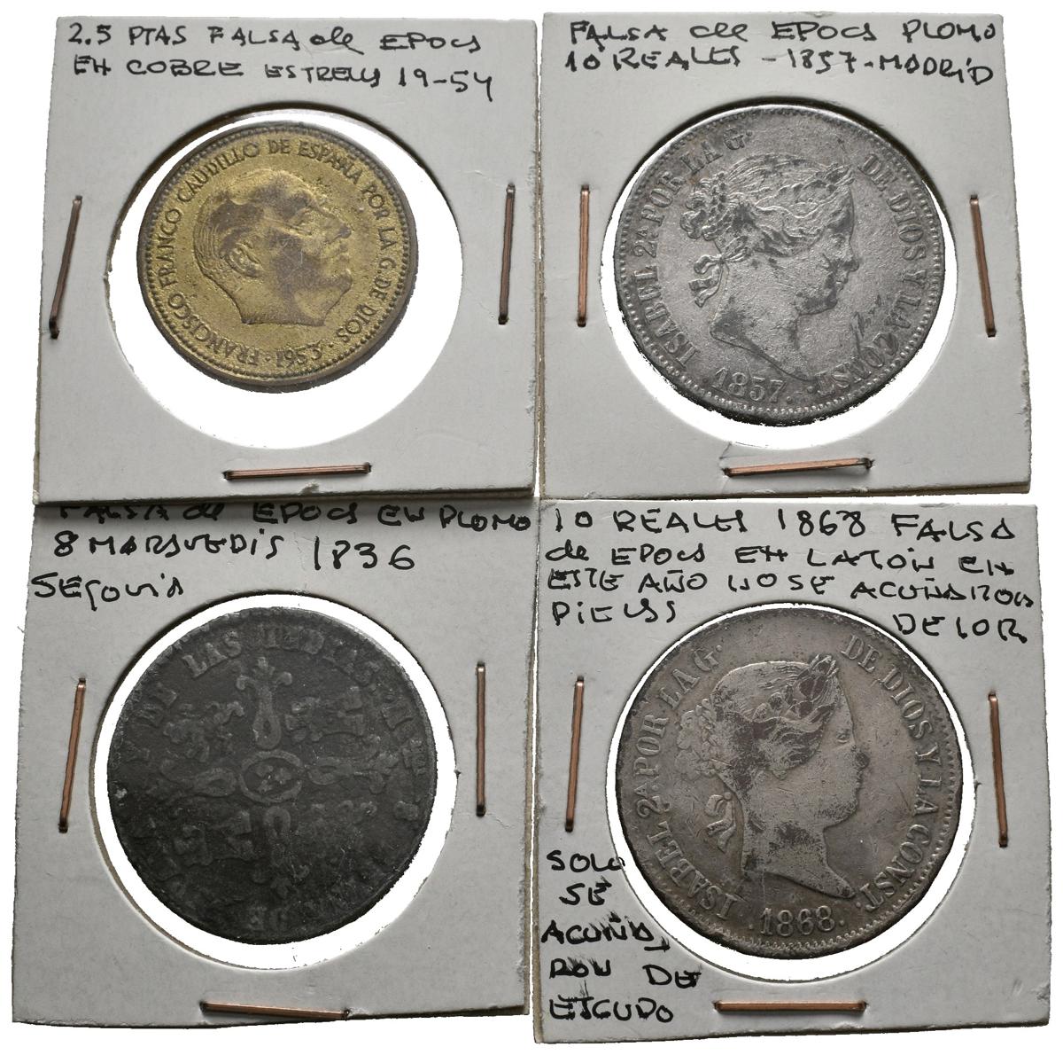 ESPAÑA. Conjunto formado por 4 monedas falsas de época, 3 de Isabel II en plomo y 1 del Estado Español en cobre. Diferentes estados de conservación. A EXAMINAR.
