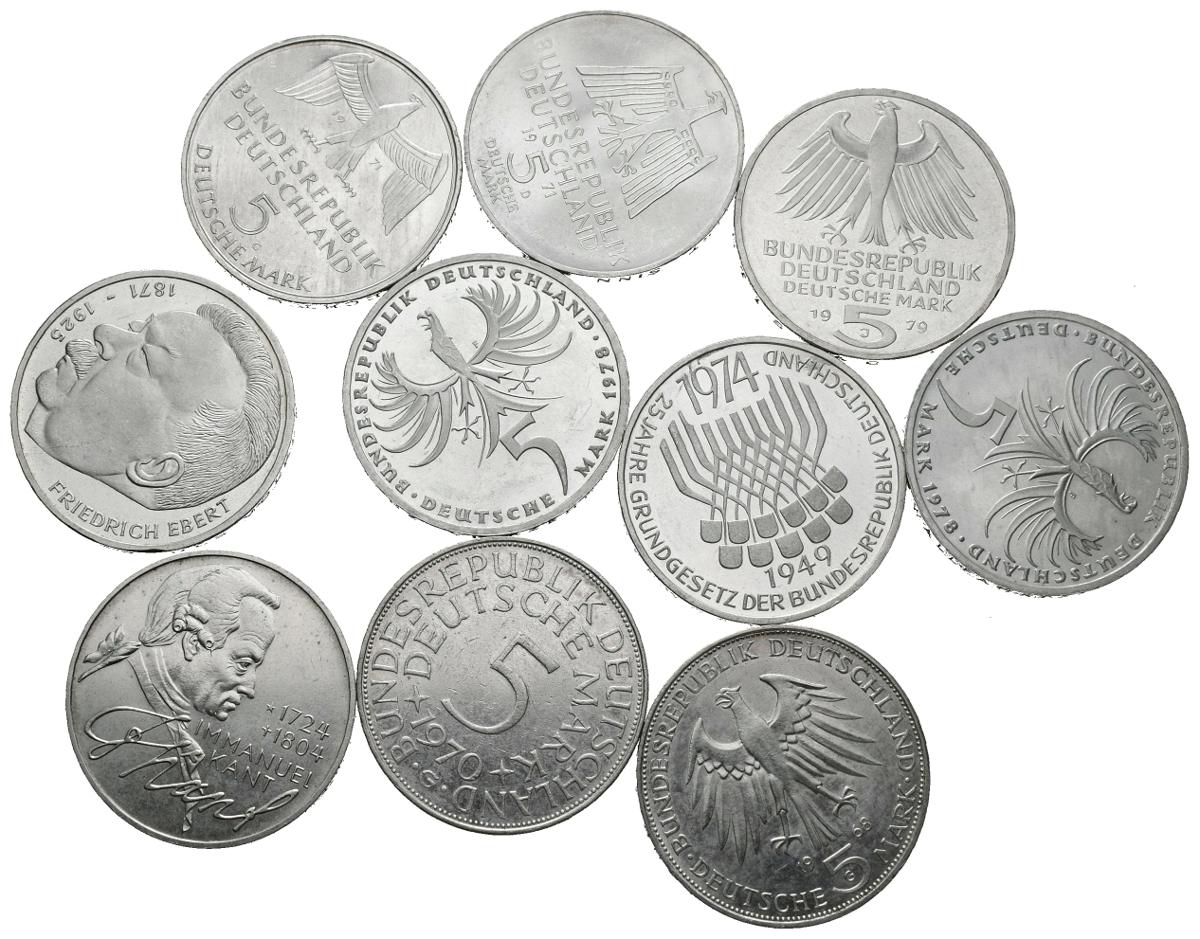 ALEMANIA. Extraordinario conjunto formado por 10 monedas de 5 Marcos alemanes de plata y de fechas comprendidas entre 1968 y 1979. Ninguna pieza repetida. Estados de conservaciones muy altos, encontrando piezas SC. A EXAMINAR.