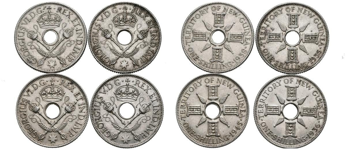 NUEVA GUINEA. Conjunto de 4 monedas de plata de 1 Shilling de fechas diferentes: 1935, 1936, 1938 y 1945. Diferentes estados de conservación. A EXAMINAR.