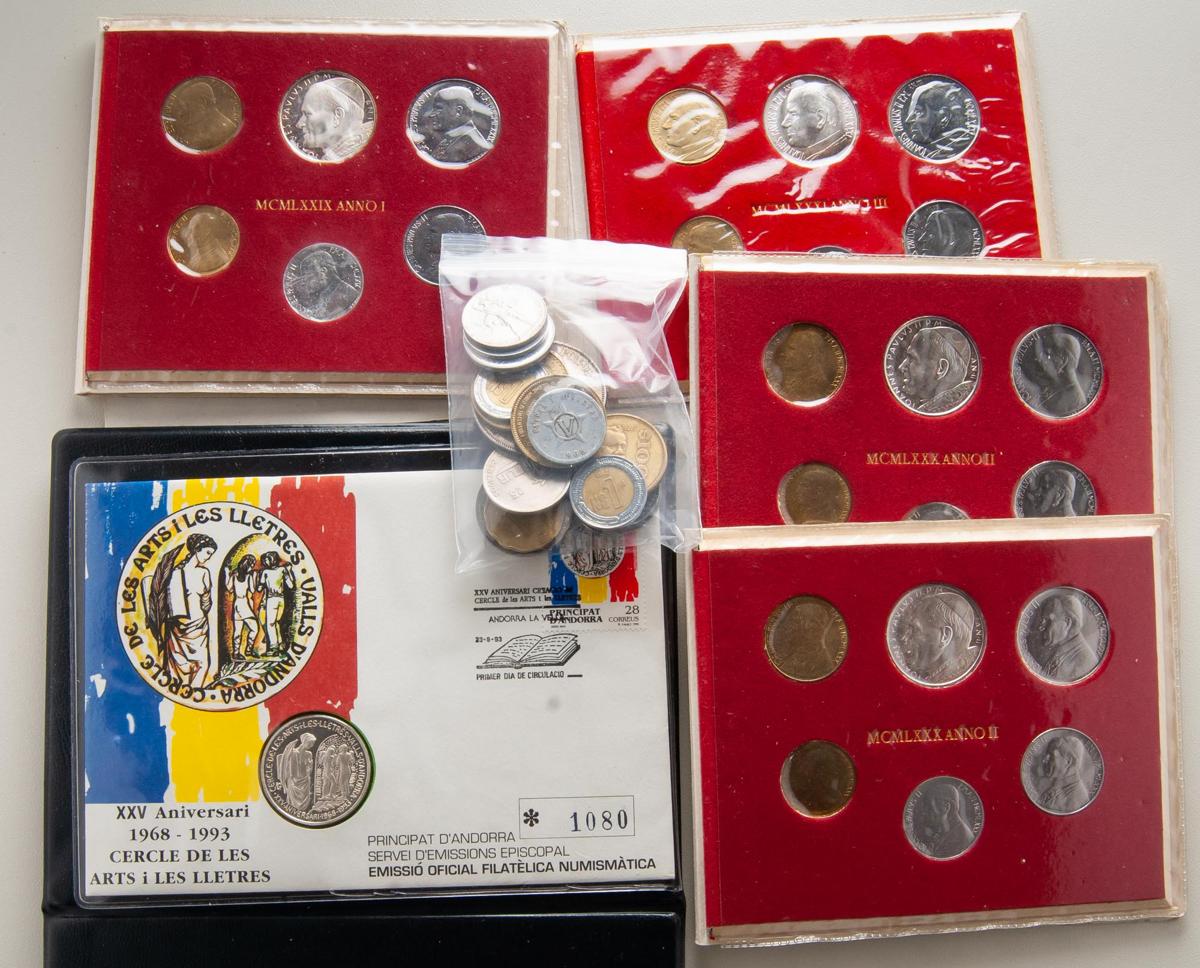MONEDAS EXTRANJERAS. Interesante conjunto donde destacan 4 carteras del Vaticano de 1980 (Series I, II y III) y moneda conmemorativa de 5 Diners de Andorra de 1993 en estuche original. Diferentes estados de conservación. A EXAMINAR.