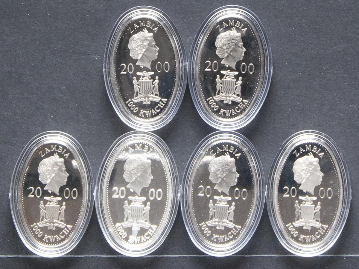 MONEDAS EXTRANJERAS. Bonito conjunto formado por 6 monedas de Zambia de 1000 Kwacha. Pieza de Cupro-niquel coloreadas. Serie 1000 años de Exploración. Año. 2000. SC. Presentadas en capuslas.