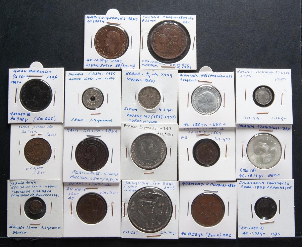 MONEDAS EXTRANJERAS. Interesante conjunto formado por 17 monedas de diferentes países y acuñadas en los siglo XIX y XX. Entre las piezas destacan 1/2 Penny británico de 1806, una pareja de 10 y 20 Reis brasileños de 1869 y algunas piezas en plata. Diferentes estados de conservación. A EXAMINAR.