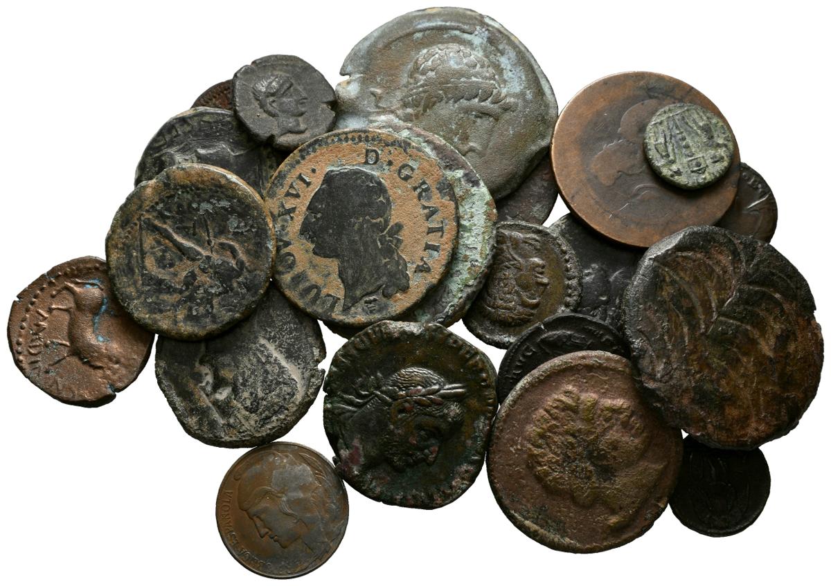 Conjunto de 22 monedas de bronce de distintas épocas, contiene algunas reproducciones. A EXAMINAR.
