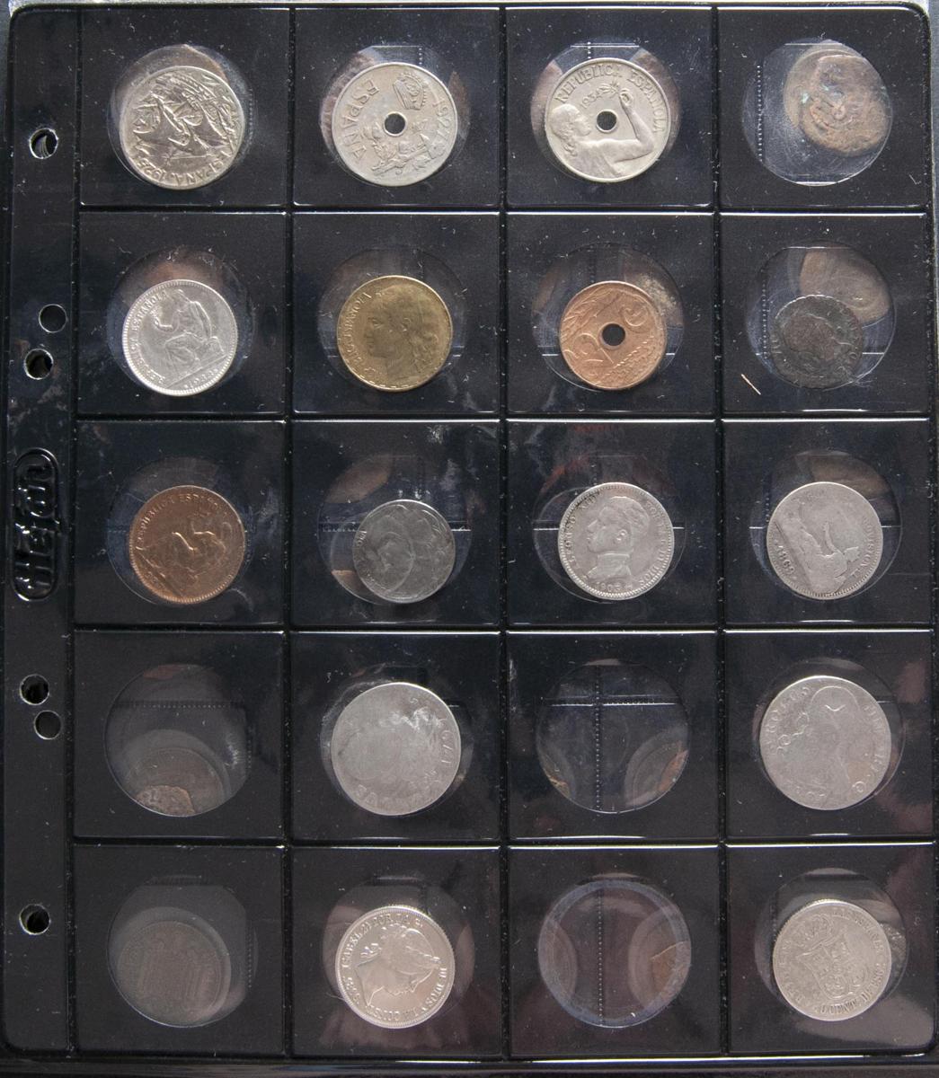 Interesante conjunto formado por decenas de monedas que podemos dividir en tres bloques diferente: una representanción de moneda española que abarca desde cobres acuñados en el periodo de monarquía hasta piezas del estado español, incluyendo un buen número de piezas en plata, destacando varias piezas de 40 Céntimos de Escudos de Isabel II y de la II República. El segundo bloque lo foman monedas extranjeras en bronce y plata destacando piezas francesas y de Suiza. Por último, representación de euros y divisores en tiras (euros "muestra") y bolsitas de la FNMT además de una cartera del Vaticano de 2015, y material de Andorra y San Marino. Diferente estados de conservación. A EXAMINAR.