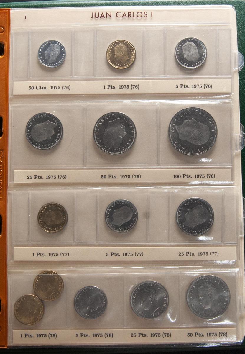 CONTEMPORÁNEO. Magnífica colección completa de monedas acuñadas bajo el reinado de Juan Carlos I (1975-2014). El conjunto está distribuído en 2 impecables álbumes Pronumas con aproximadamente 178 monedas todas ellas sin repetir y en estado sin circular procedentes de carteras. El conjunto incluye varias piezas a tener en cuenta como las 5 Pesetas de 1975 *80 (error del mundial), las 50 Pesetas de 1984, o las 1 y 200 Pesetas E-87. El conjunto se completa con 8 piezas de 2000 Pesetas en plata. A EXAMINAR.
