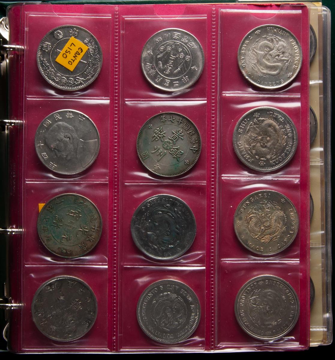 CHINA. Extraordinaria colección formada por más de 1300 monedas dispuestas en 4 álbumes y bandejas donde encontraremos un gran número de cecas, prefecturas y provincias representadas, así como valores, módulo y materiales, destacando también la inclusión de medallas y amuletos.Desde la era de la dinastía Han (206 a.C. – 221 d.C.) la cuál consolidó a China como unidad político-administrativa y que impulsó el wu zhu como circulante predominante hasta la dinastía Song con la que se inicia un periodo considerado de esplendor que incluye entre sus principales características el ser el primer gobierno del mundo en usar el papel moneda, pasando por la Tang, a principios del siglo VII d.C, la representación de monetaria del medievo chino es extensa, destacando una amplia selección de los tipos más usados a lo largo de toda la numismática china: el Cash. Este tipo de moneda, por lo general de cobre, fue usado, no sólo por China sino también por otros países del sudeste asiático, entre el siglo II a.C. y el siglo XX d.C. conservando una de sus principales señas de identidad: el agujero cuadrado central que permitía que las monedas se unieran mediante un cordel para crear valores más altos ya que, por lo general, eran monedas de escaso valor.Superado el medievo y la dinastía Ming, incluidos sus últimos y turbulentos años de rebeliones campesinas, es la Dinastía Qing la que toma el relevo protagonista en la colección. No en vano, esta estirpe se perpetúa en el poder del país desde el 1644 a 1912. Tras ellos las injerencias de occidente y guerras varias nos llevan hasta el inicio de un periodo de República hasta 1949 y una posterior República Popular. Los “Fatman dollar”, acuñados con el propósito de imponer cierto orden ante la caótica situación del sistema monetario chino a principios del siglo XX, junto con los dólares de comercio o los de dragón son otros buenos ejemplos del tipo de piezas que podemos encontrar en este compendio.Nota importante: este lote incluye tanto monedas originales como reproducciones coetáneas y/o modernas. Diferentes estados de conservación en toda la colección. IMPRESCINDIBLE EXAMINAR. Este lote no admite devolución y se vende "tal cual".