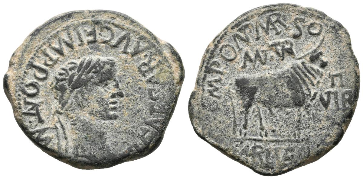 TURIASO (Tarazona, Zaragoza). As. (Ae. 12,47g/31mm). 14-36 d.C. (FAB-2450). Anv: Cabeza laureada de Tiberio a derecha, alrededor leyenda: TI CAESAR AVG F IMP PONT M. Rev: Toro a derecha, encima MVN TVR, delante II VIR, alrededor leyenda: M PONT MARSO C MARI VEGETO. MBC.