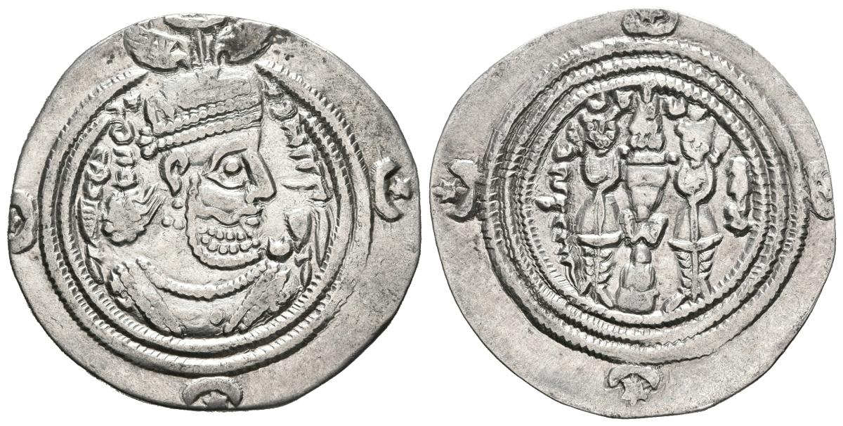 IMPERIO SASANIDA, Khusro II. Dracma. (Ar. 2,78g/28mm). Año 5. WYHC (Ceca incierta). Anv: Busto coronado a derecha, a la izquierda estrella, a la derehca estrella y creciente. Rev: Altar con fuego entre dos guardianes, entre estrella y creciente. MBC-.