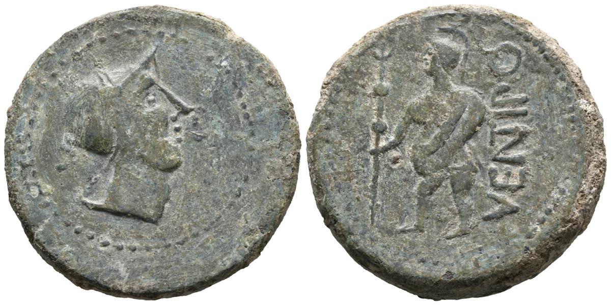 VENTIPO (Casariche, Sevilla). As. (Ae. 25,60g/31mm). 150-50 a.C. (FAB-2517). Anv: Cabeza masculina con casco a derecha. Rev: Soldado con escudo y lanza a izquierda, detrás leyenda: VENTIPO. MBC.