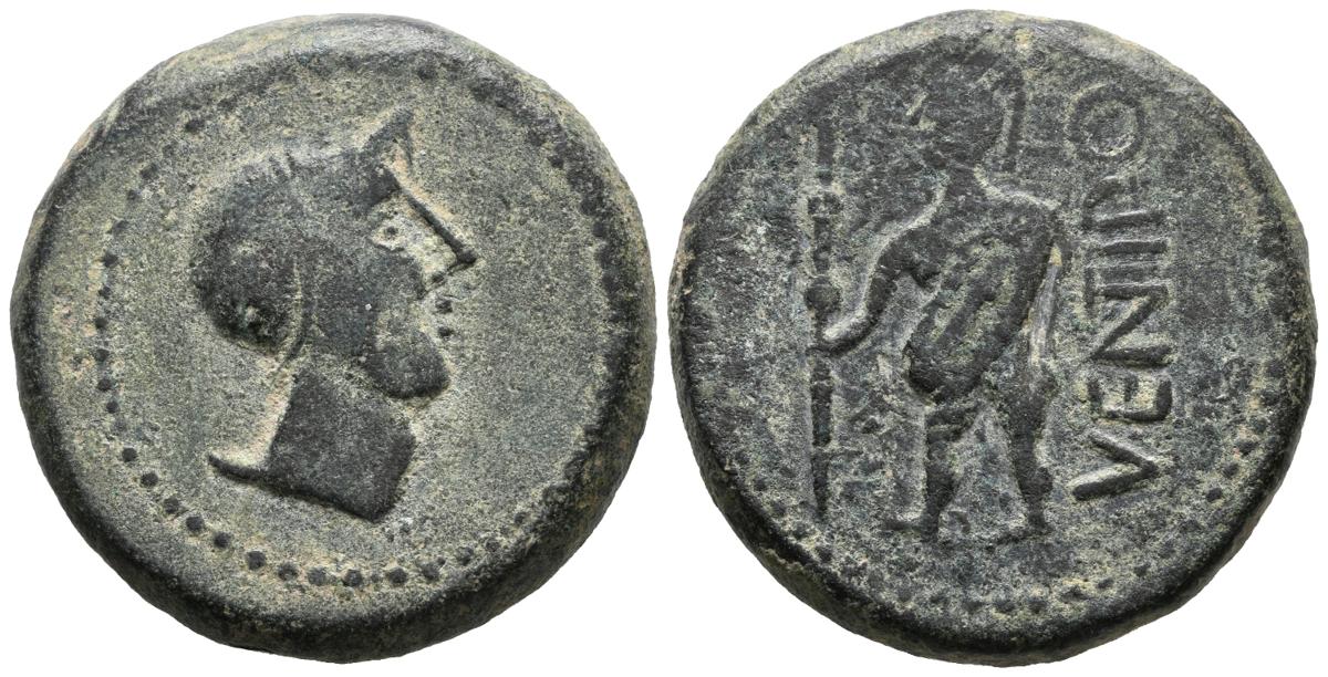 VENTIPO (Casariche, Sevilla). As. (Ae. 28,16g/32mm). 150-50 a.C. (FAB-2517). Anv: Cabeza masculina con casco a derecha. Rev: Soldado con escudo y lanza a izquierda, detrás leyenda: VENTIPO. MBC.