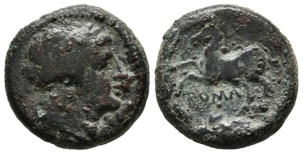 ACUÑACIONES ANONIMAS. Litra. (Ae. 3,35g/16mm). 234-231 a.C. Roma. (Crawford 26/3). Anv: Cabeza laureada de Apolo a derecha. Rev: Caballo a izquierda, debajo leyenda: ROMA. MBC-/MBC.