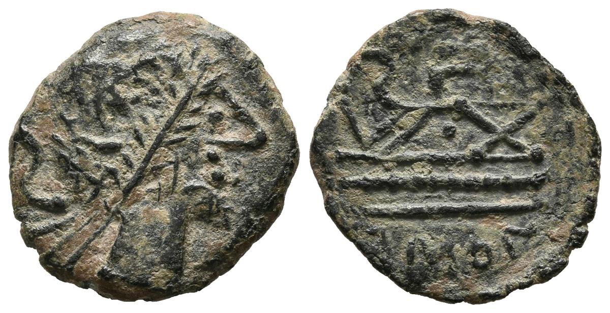 ACUÑACIONES ANONIMAS. Semis de imitación Hispana. (Ae. 2,05g/17mm). 211 a.C. Roma. (Crawford 350b/1). Anv: Cabeza de Saturno a derecha, detrás S. Rev: Proa a izquierda, encima S, debajo leyenda retrógada: AMOR. MBC.