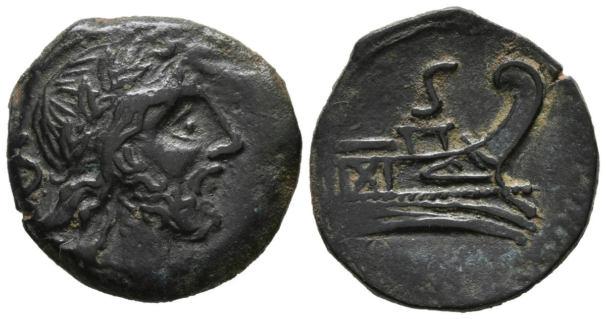 ACUÑACIONES ANONIMAS. Semis de imitación hispana. (Ae. 6,15g/22mm). 211-206 a.C. (Crawford 56/3). Anv: Cabeza de Saturno a derecha, detrás S. Rev: Proa a derecha, encima S tumbada. MBC+.