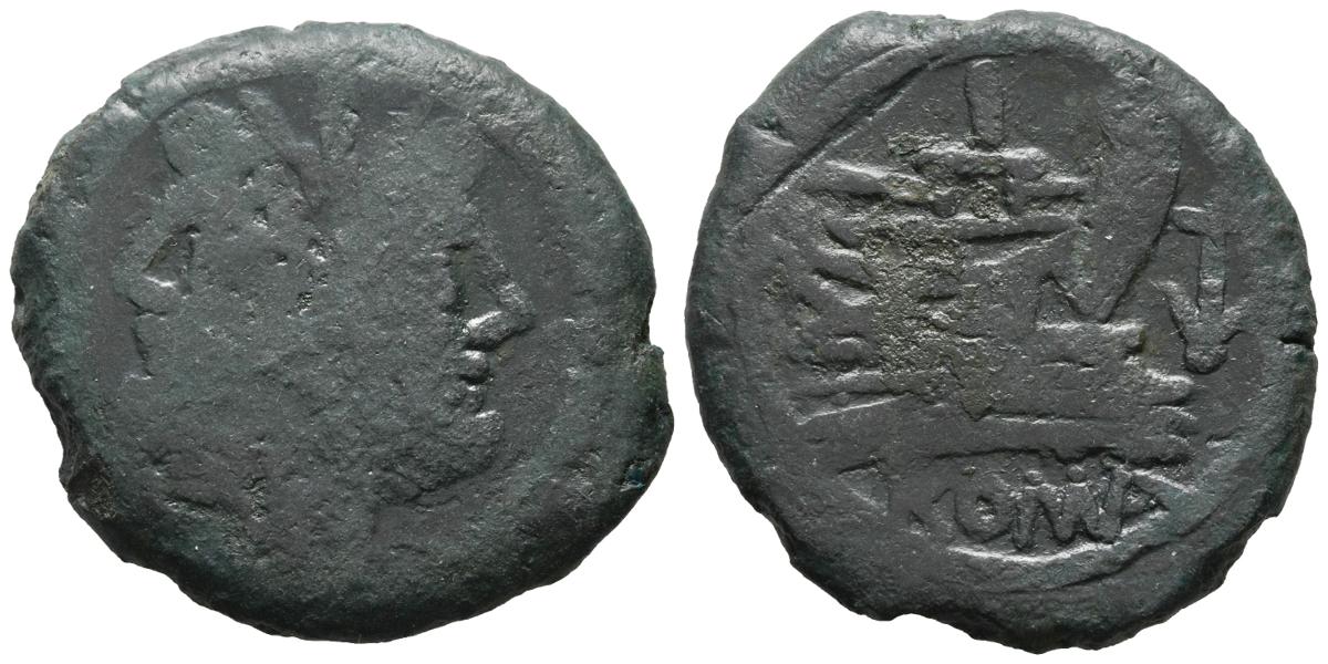 ACUÑACIONES ANONIMAS. As. (Ae. 16,31g/33mm). 209-208 a.C. Roma. (Crawford 50/3). Anv: Cabeza de Jano bifronte, encima I. Rev: Proa a derecha, encima I, debajo leyenda: ROMA, delante ancla hacia abajo. BC-/BC.