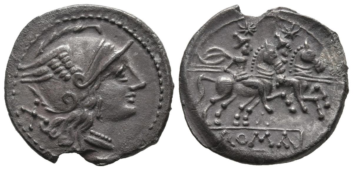 ACUÑACIONES ANONIMAS. Denario (Ar. 3,33g/20mm). 211-209 a.C. Sur de Italia. (Crawford 44/5; FFC 7). Anv: Cabeza de Roma a derecha, detrás X. Rev: Dioscuros a caballo a derecha, encima estrellas, en exergo: ROMA. MBC+. Cospel faltado.