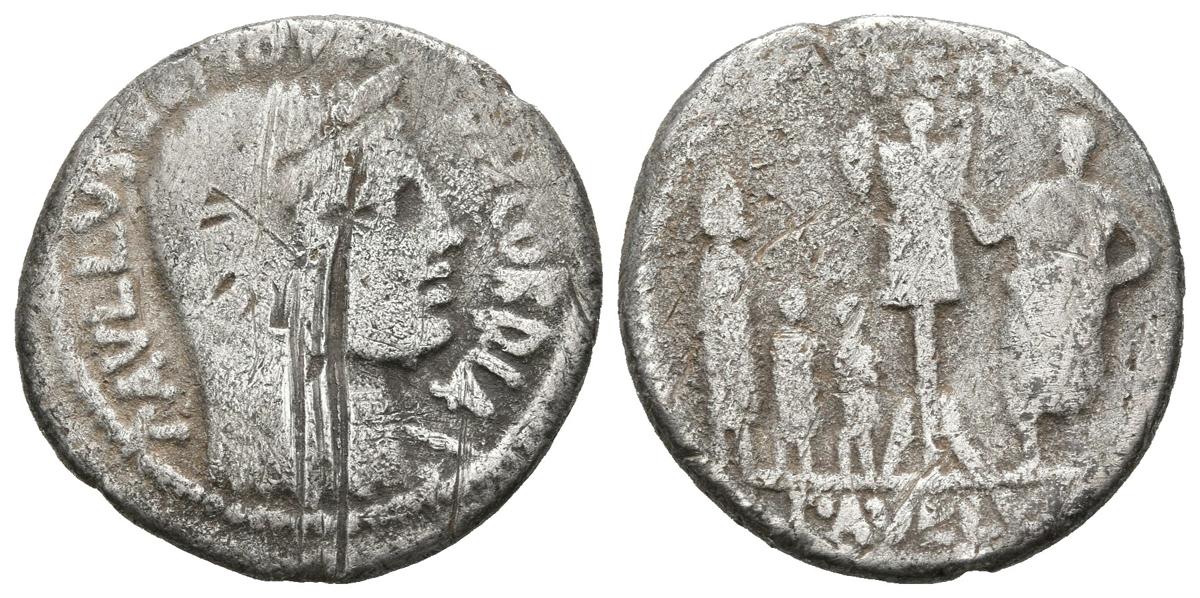 GENS AEMILIA. Denario (Ar. 3,38g/18mm). 62 a.C. Roma. (Crawford 415/1; FFC 126). Anv: Cabeza velada y diademada de Concordia a derecha, alrededor leyenda: PAVLVS LEPIDVS CONCORDIA. Rev: Trofeo entre dos personaje y dos niños debajo, debajo leyenda: PAVLLVS y encima :TER. BC+. Marcas en anverso.
