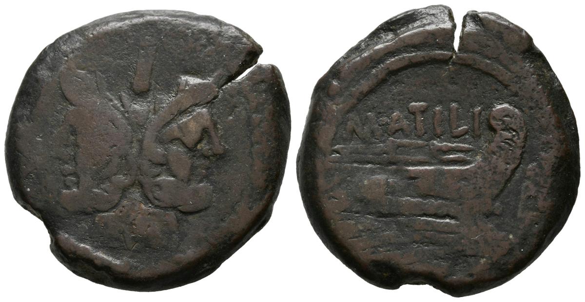 GENS ATILIA. As. (Ae. 21,76g/31mm). 148 a.C. Roma. (Crawford 214/2a). Anv: Cabeza de Jano bifronte, encima I. Rev: Proa a derecha, encima leyenda: M ATILI, delante I, debajo leyenda: ROMA. MBC-.