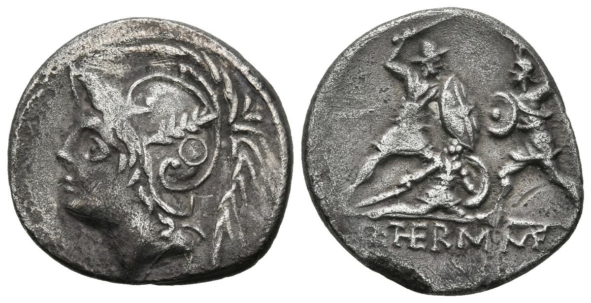 GENS MINUCIA. Denario. (Ar. 3,70g/20mm). 103 a.C Roma. (Crawford 319/1; FFC 928). Anv: Cabeza de Marte a izquierda. Rev: Dos soldados luchando entre ellos, detrás otro caído en el suelo, en exergo: Q THERM MF. MBC+.