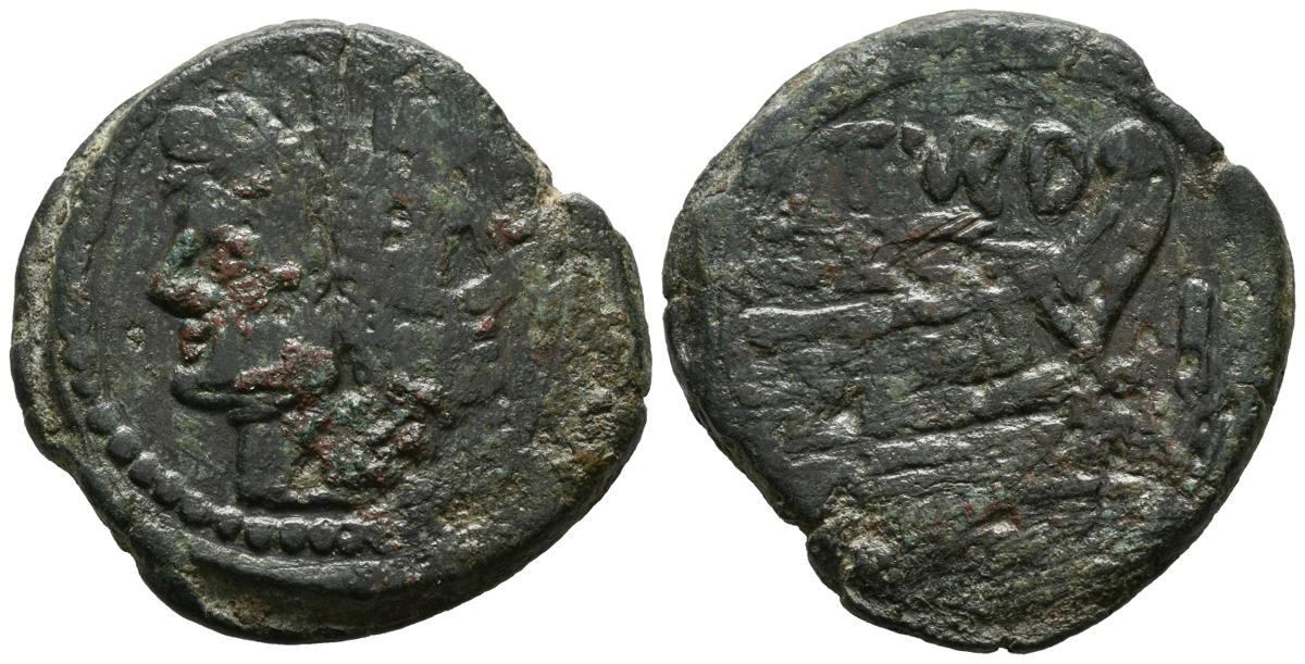 GENS PAPIRIA. As. (Ae. 20,23g/32mm). 169-158 a.C. Roma. (Crawford 193/1). Anv: Cabeza de Jano bifronte, encima I. Rev: Proa a derecha, encima leyenda: TVRD, debajo leyenda: ROMA, delante I. MBC-.