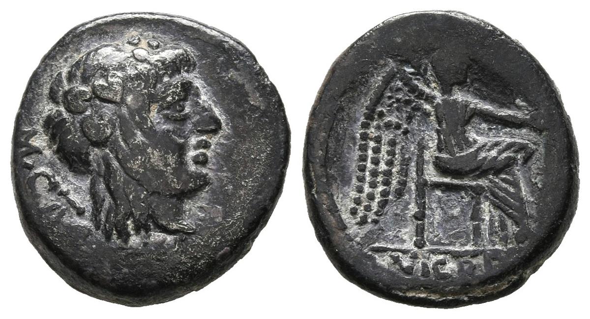 GENS PORCIA. Quinario. (Ar. 1,92g/14mm). 89 a.C. Roma. (Crawford 343/2b). Anv: Cabeza laureada de Libertas a derecha, detrás leyenda: M CATO. Rev: Victoria sentada a derecha, debajo leyenda: VICTRIX. MBC. Pátina oscura.