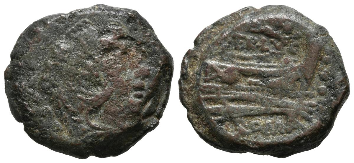 GENS TERENTIA. Cuadrante. (Ae. 6,99g/20mm). 147 a.C. Roma. (Crawford 217/5). Anv: Cabeza de Hércules a derecha con cabeza de león, detrás tres puntos. Rev: Proa a derecha, encima Victoria volando a derecha, encima leyenda: C TER LVC, debajo leyenda: ROMA, delante tres puntos. BC/MBC-.