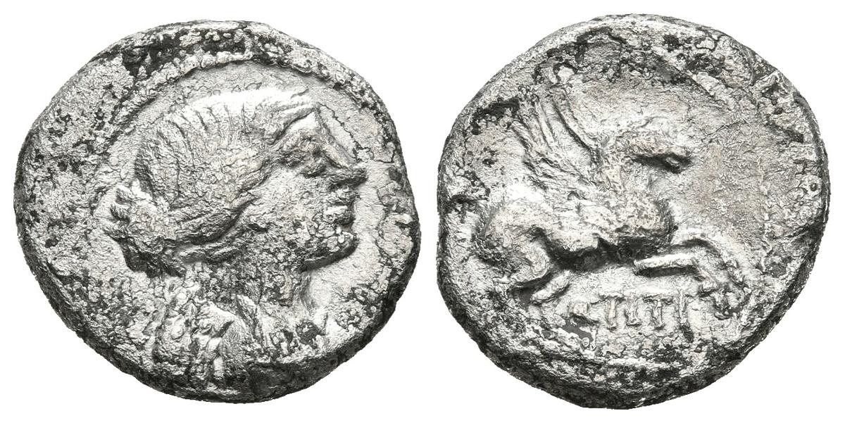 GENS TITIA. Quinario. (Ar. 1,96g/14mm). 90 a.C. Roma. (Crawford 341/3). Anv: Busto drapeado de Victoria a derecha. Rev: Pegaso a derecha, debajo leyenda: Q TITI. MBC.
