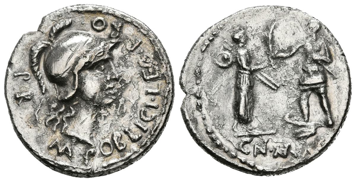 POMPEYO, el Grande. Denario. (Ar. 3,65g/20mm). 46-45 a.C. Hispania. (FFC 1; Crawford 469a). Anv: Cabeza de Palas a derecha, alrededor leyenda: M POBLICI LEG PRO PR, todo dentro de gráfila de puntos y rayas. Rev: Cnaeus Pompeius hijo de pie a izquierda, con un pie sobre proa de barco, entregando una palma a la Bética de pie a derecha con escudo y dos jabalinas, alrededor leyenda: CN MAGNVS IMP. MBC.