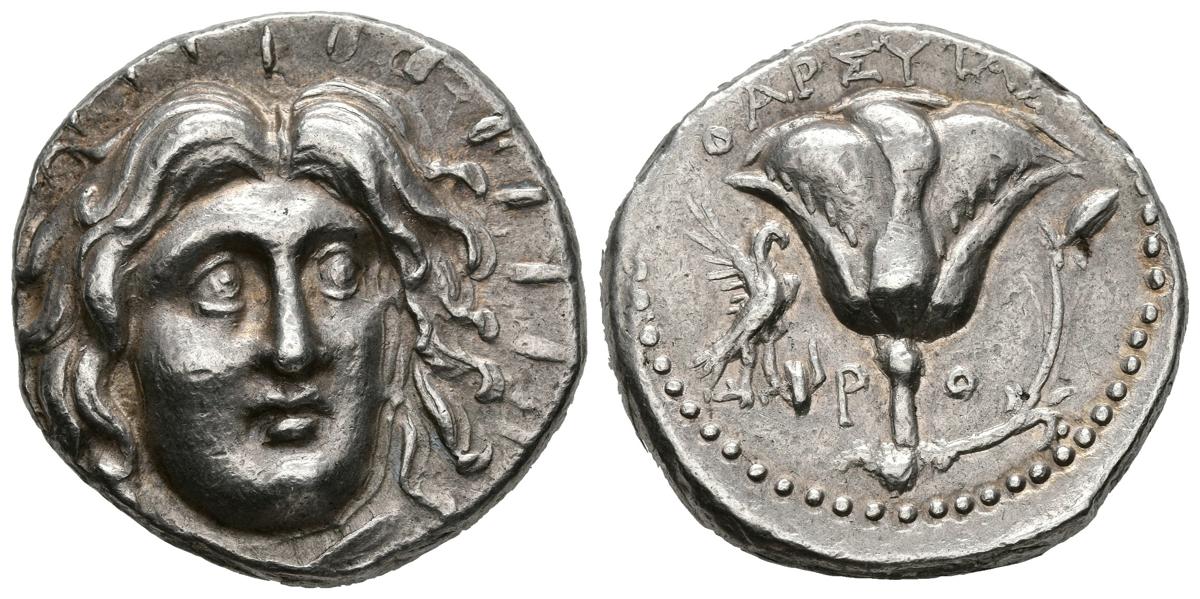ISLAS DE CARIA, Rodas. Tetradracma. (Ar. 13,18g/25mm). 304-190 a.C. Anv: Cabeza de frente de Apolo radiado ligeramente a derecha. Rev: Rosa entre P-O, brote a su derecha y águila, mirando a derecha, a su izquierda, encima leyenda griega. (SNG Copenhagen 756; SNG von Aulock 2802). EBC-. Bonito ejemplar.Quizás, tras su famoso Coloso, la rosa sea lo más emblemático de esta isla del Egeo. Se muestra por el tronco, aunque, excepcionalmente, puede presentarse vista por encima haciendo visibles sus estambres y pistilo. En el anverso, el rostro de Helios también es muy característico, apareciendo en todas sus monedas, como elemento alusivo al propio Coloso pero también como personificación del astro solar a quien se le representaba como un joven en total plenitud y de gran belleza, normalmente con su cabeza rodeada de rayos. No es casual su apariencia casi siempre frontal, casi desafiante, viniendo a tener una función protectora frente a cualquier injerencia externa que se precie.