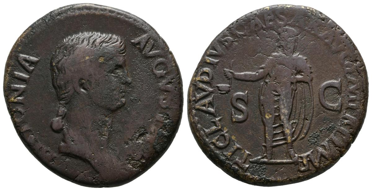 ANTONIA. Dupondio (Ae. 12,48g/28mm). 41-42 d.C. Roma. (RIC 92). Acuñación de Claudio. Anv: busto descubierto a derecha, en leyenda: ANTONIA AVGUSTA; Rev: Claudio velado en pie a izquierda con símpulo. Leyenda: TI CLAVDIVS CAESAR AVG P M. TR P IMP S.C. MBC-. Escasa.