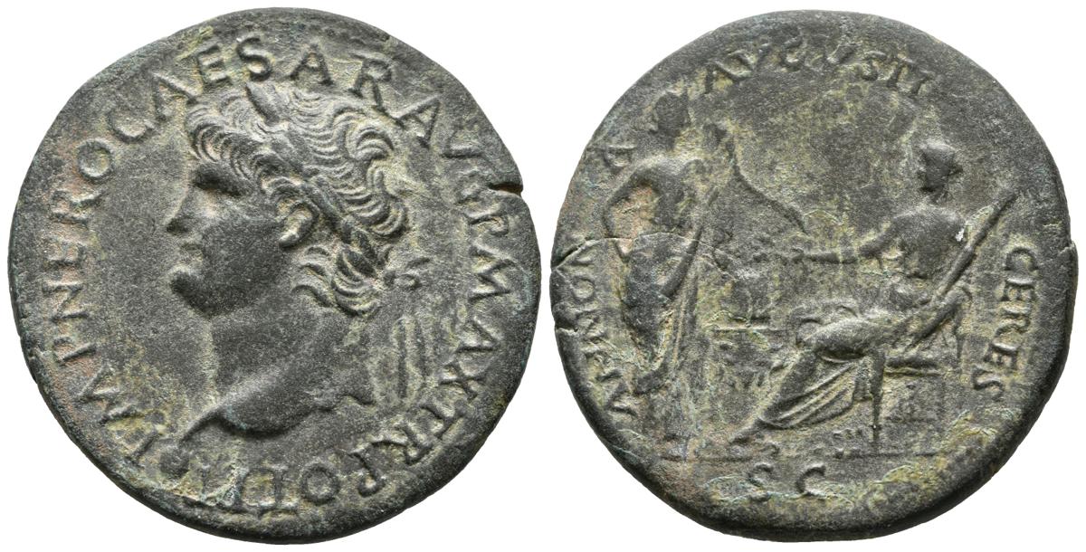 NERON. Sestercio. (Ae. 22,85g/36mm). 65 d.C. Roma. (RIC 572). Anv: Cabeza laureada de Nerón a izquierda, alrededor leyenda: IMP NERO CAESAR AVG P MAX TR POT P P. Rev: Annona estante a derecha portando cornucopia, en frente Ceres sentada a izquierda portando antorcha y espiga, entre ellas modio sobre altar, al fondo timón, alrededor leyenda: ANNONA AVGVSTI CERES. MBC+. Escaso.
