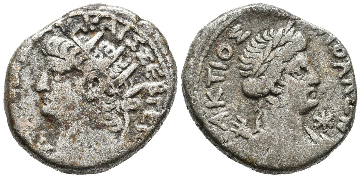NERON. Tetradracma. (Ve. 11,83g/25mm). 67-68 d.C. Alejandría. (RPC 5315). Anv: Busto radiado de Nerón a izquierda, alrededor leyenda en griego. Rev: Busto laureado y drapeado de Apolos Aktios a derecha con carcaj sobre hombro derecho y estrella delante, alrededor leyenda en griego. MBC-.