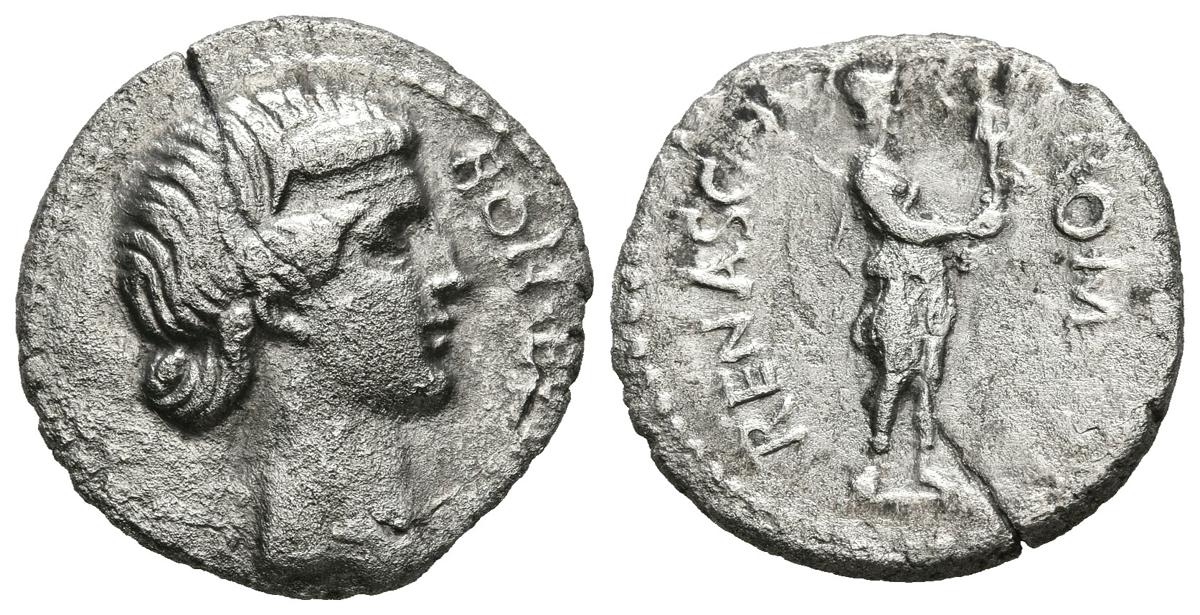 GUERRAS CIVILES. Denario. (Ar. 3,31g/18mm). 68 d.C. Tarraco. (RIC 9). Anv: Cabeza diademada de Bonus Eventus a derecha, delante leyenda. BON EVENt. Rev: Roma estante a derecha sosteniendo Victoria y lanza, alrededor leyenda: ROMA RENASC. MBC. Grieta.