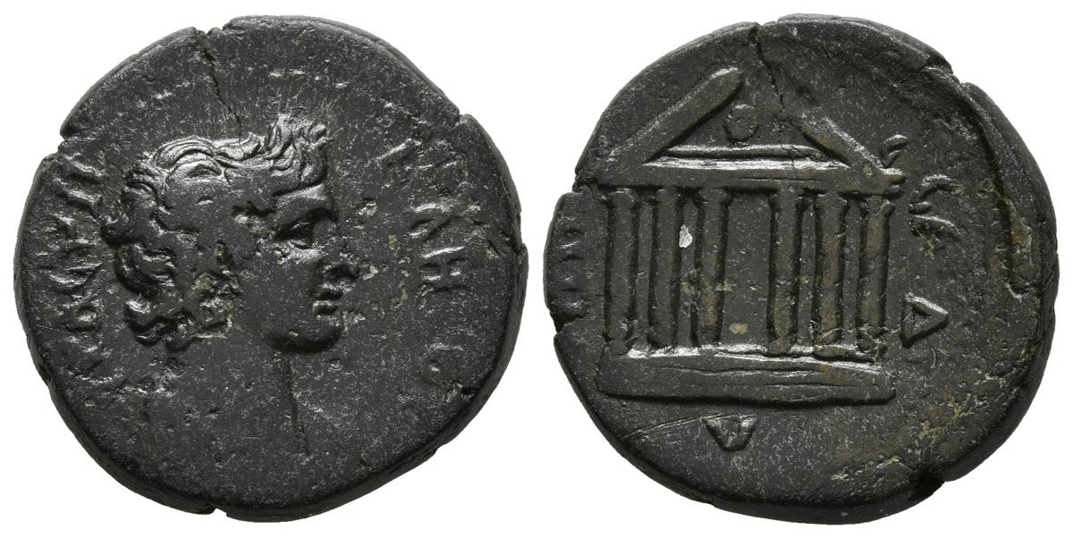 SARDES (Lydia). Ae 17 (Ae. 3,68g/17mm). 69-79 d.C. Moneda Provincial. Época de Vespasiano (RPC II-1310). Anv: busto drapeado a derecha, leyenda en griego: Rev: templo hexástilo con globo en frontón. MBC-