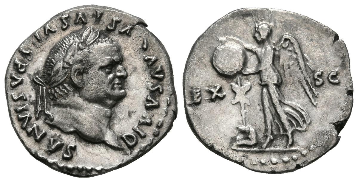 DIVO VESPASIANO. Denario. (Ar. 2,83g/19mm). 80-81 d.C. Roma. (RIC 364). Anv: Cabeza laureada de Divo Vespasiano, alrededor leyenda: DIVVS AVGVSTVS VESPASIANVS. Rev: Victoria estante a izquierda colocando escudo sobre trofeo con Judaea sentada a izquierda, entre EX-SC. MBC+.