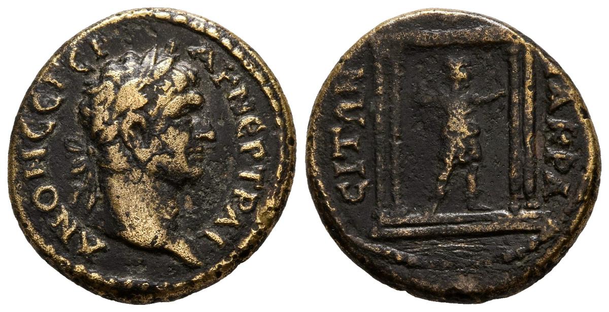 TRAJANO. Ae19 (Ae.3,70g/18mm). Nakrasa, Lydia. 98-117 d.C. (SNG. 3035). Anv: busto laureado a derecha; Rev: templo con imagen en su interior de Artemisa, culto a la caza. MBC-. Pátina irregular.