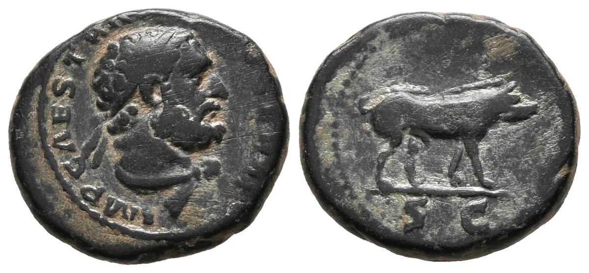 TRAJANO. Cuadrante (Ae. 2,85g/16mm). 98-117 d.C. Roma. (RIC 702). Anv: Busto de Hércules barbado con piel de león, alrededor leyenda: IMP CAES TRAIAN AVG GERM. Rev: Jabalí a derecha, SC en exergo. MBC.