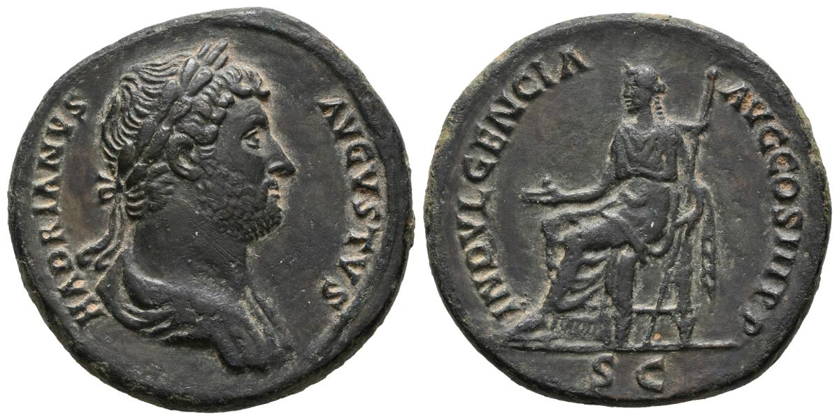 ADRIANO. As. (Ae. 11,23g/26mm). 124-128 d.C. Roma. (RIC 725 var). Anv. Busto laureado y drapeado de Adriano a derecha, alrededor leyenda: HADRIANVS AVGVSTVS. Rev: Indulgentia sentada a izquierda extendiendo mano y portando cetro, debajo SC, alrededor leyenda: INDVLGENCIA AVG COS III P P. MBC+. Repasado.