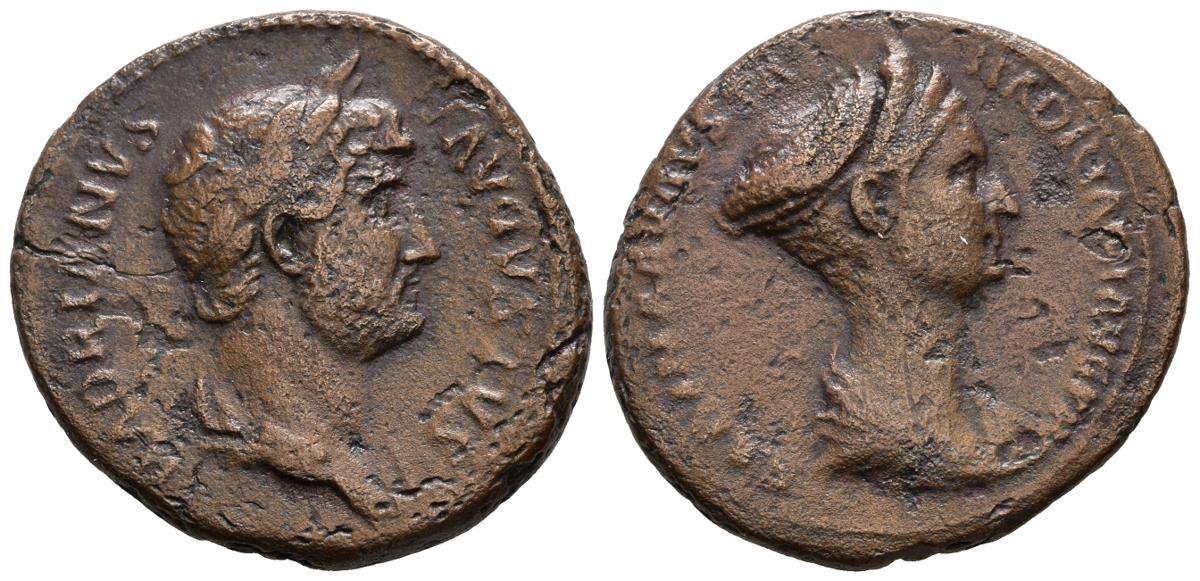 ADRIANO. As. (Ae. 11,20g/29mm). 128-132 d.C. Roma. (RIC 981 var). Anv: Busto laureado y drapeado de Adriano a derecha, alrededor leyenda: HADRIANVS AVGVSTVS. Rev: Busto diademado y drapeado a derecha, alrededor leyenda: SABINA AVGVSTA HADRIANI AVG. MBC-.