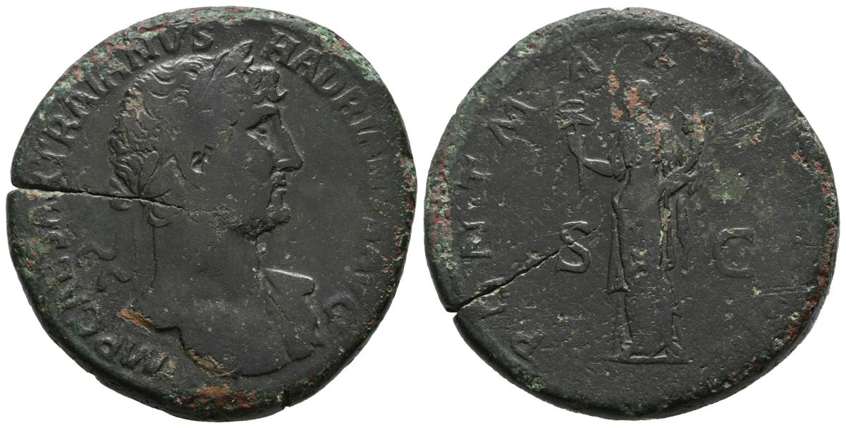 ADRIANO. Sestercio (Ae. 30,14g/34mm). 119-121 d.C. Roma. (RIC 563a). Anv: Busto laureado de Hadraino a derecha con con drapeado sobre hombro izquierdo, alrededor leyenda: IMP CAESAR TRAIANVS HADRIANVS AVG. Rev: Felicidad estante con caduceo y cornucopia a izquierda, entre S-C, alrededor leyenda: PONT MAX TR COS III. BC+. Grieta.