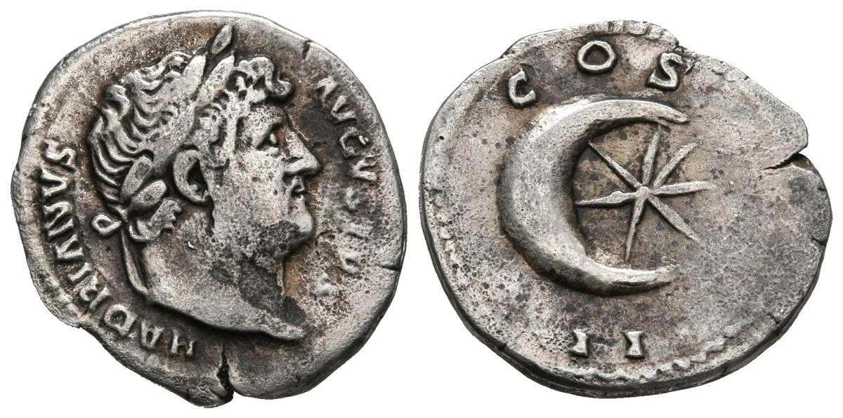 ADRIANO. Denario (Ar. 2,84g/18mm). 125-128 d.C. Roma. (RIC 201). Anv: busto laureado a derecha, alrededor leyenda: HADRIANVS AVGVSTVS. Rev: estrella dentro de creciente, alrededor leyenda: COS III. MBC-