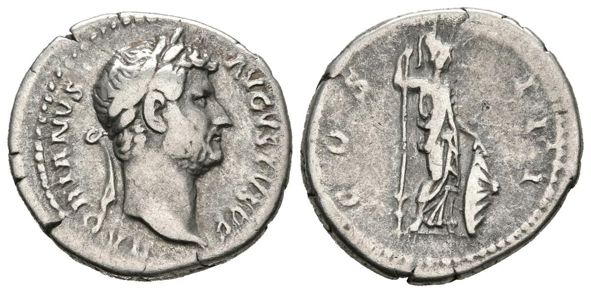 ADRIANO. Denario. (Ar. 3,33g/18mm). 134-138 d.C. Roma. (RIC 330). Anv: Cabeza laureada de Adriano a derecha, alrededor leyenda: HADRIANVS AVGVSTVS P P. Rev: Minerva estante a derecha portando lanza y escudo, alrededor leyenda: COS III. MBC.