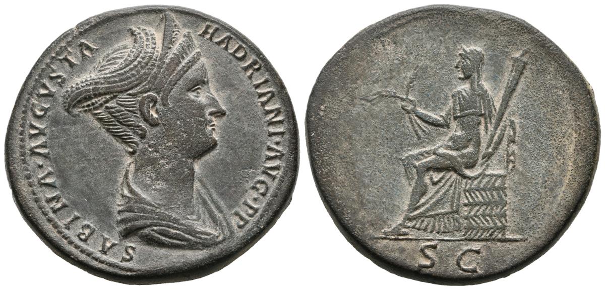 SABINA. Sestercio. (Ae. 26,27g/34mm). 128-129 d.C. Roma. (RIC 2495). Anv: Busto drapeado de Sabina con triple tiara a derecha, alrededor leyenda: SABINA AVGVSTA HADRIANI AVG P P. Rev: Ceres sentada a izquierda sobre cesta portando palma y antorcha, en exergo SC. EBC-. Retocado. Raro ejemplar.