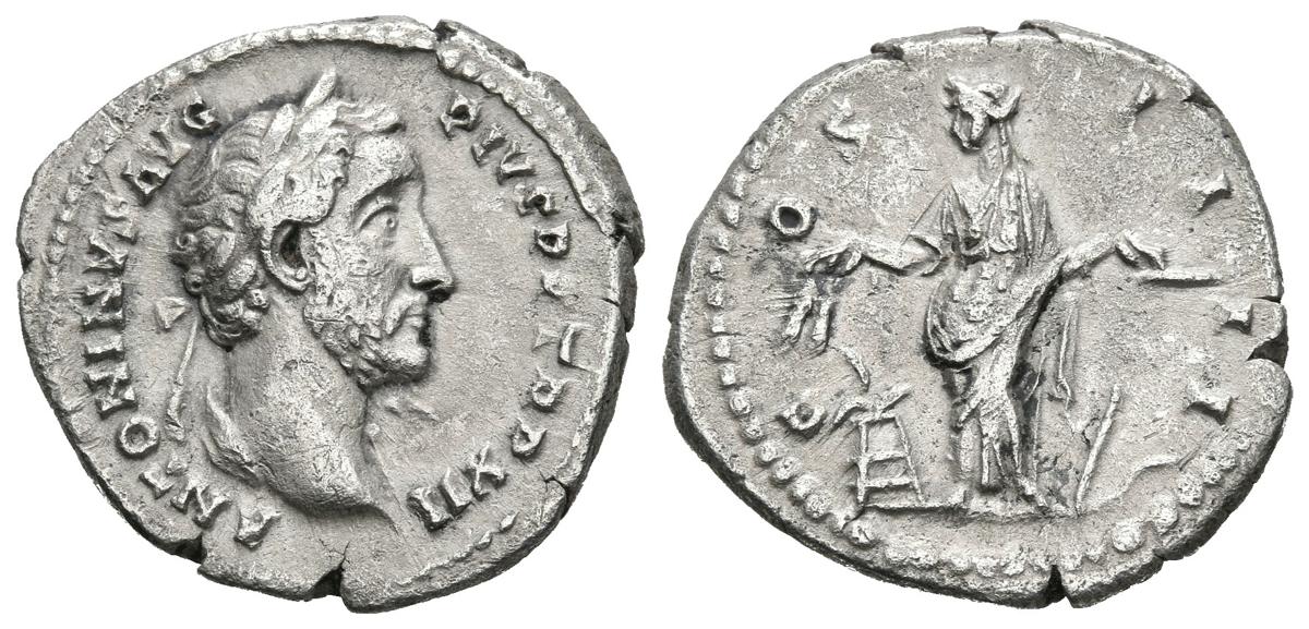 ANTONINO PIO. Denario. (Ar. 2,98g/19mm). 147-148 d.C. Rome. (RIC 162). Anv: Busto laureado de Antonino Pío a derecha, alrededor leyenda: ANTONINVS AVG PIVS P P TR P XI. Rev: Anona con espigas y ancla, a sus pies modio, alrededor leyenda: COS IIII. MBC.