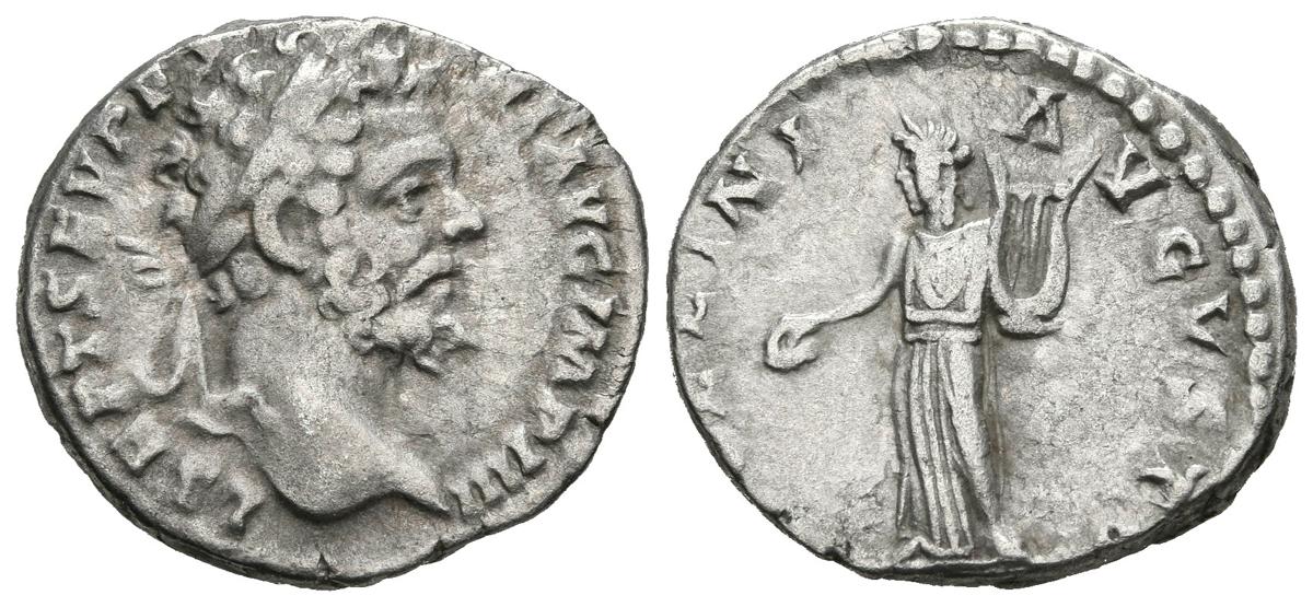 SEPTIMIO SEVERO. Denario (Ar. 3,28g/18mm). 194-195 d.C. Roma. (RIC 40). Anv: Cabeza laureada de Septimio Severo a derecha, alrededor leyenda: L SEPT SEV PERT AVG IMP IIII. Rev: Apolo estante a izquierda portando pátera y lira, alrededor leyenda: APOLLINI AVGVSTO. MBC.