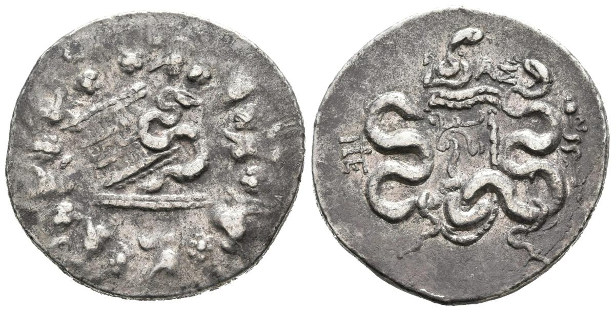 MISIA, Pérgamo. Cistóforo. (Ar. 12,61g/28mm). 95-92 a.C. (SNG Paris 1725). Anv: Serpiente saliendo de cesta dentro de corona de laurel con frutas. Rev: Dos serpientes entrelazadas en carcaj, encima: AS, a la derecha cetro con serpiente, a la izquierda monograma griego. MBC+.
