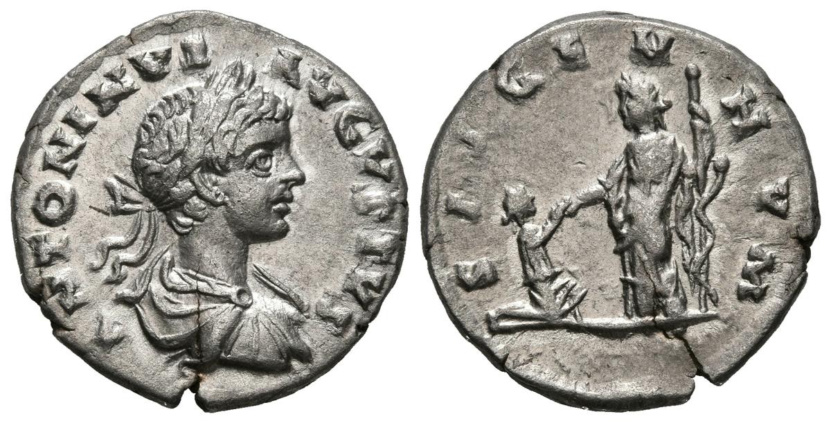 CARACALLA. Denario. (Ar. 3,40g/18mm). 199-201 d.C. Roma. (RIC 42c). Anv: Busto laureado y drapeado de Caracalla a derecha, alrededor leyenda: ANTONINVS AVGVSTVS. Rev: Salus estante a izquierda portando cetro con serpiente enrollada, extendiendo mano a mujer reclinada a derecha, alrededor leyenda: SAL GEN HVM. EBC. Grieta.